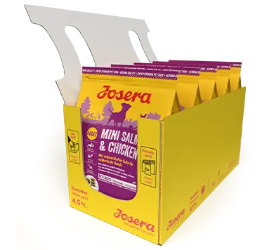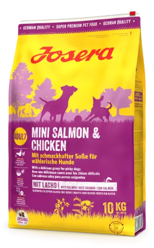 Josera Mini Salmon & Chicken версія нашого популярного корму Festival, але для дорослих собак міні-порід. Смачна безглютенова рецептура з лососем – саме для вибагливих собак, які люблять різноманітність. Завдяки інтегрованому порошковому соусу, маленькі крокети перетворюються на вишукані смаколики. Виготовляється в Німеччині та проходить ретельну перевірку у власній акредитованій лабораторії. Корм містить високоякісні, здорові та натуральні інгредієнти, які не є генетично модифікованими. БЕЗ додавання консервантів, штучних барвників та ароматизаторів. Сухий корм для собак Josera не випробовується на тваринах. БЕЗ додавання пшениці, сої, цукру і молочних продуктів. Повноцінний сухий корм для дорослих собак.